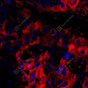 IF检测Annexin-9/ANXA9蛋白(货号 GB114601)(红色). 样品: 人食管鳞状细胞癌, 4%多聚甲醛 (货号G1101) 固定12-24小时. 抗原修复: Tris-EDTA抗原修复液(pH 9.0) (G1203), 98℃, 20分钟. 封闭: 3% BSA(货号GC305010)的PBS溶液, 室温孵育30分钟. —抗: 1: 700稀释, 4℃ 孵育过夜. 二抗: Cy3标记山羊抗兔IgG (H+L) (货号GB21303), 1: 300稀释, 室温孵育1小时. |
