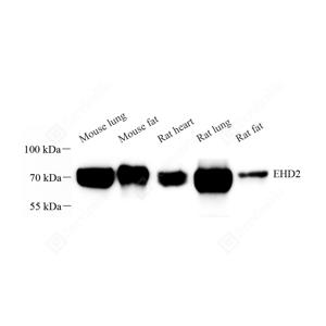 WB检测EHD2蛋白(货号 GB114403). 样品: 经RIPA裂解液(货号G2002)处理的蛋白质. 封闭: 3%脱脂牛奶(货号GC310001)溶于TBST溶液, 室温孵育1小时. —抗: 1: 2000稀释, 4℃ 孵育过夜. 二抗: HRP标记山羊抗兔IgG (H+L) (货号GB23303), 1: 5000稀释, 室温孵育1小时. |