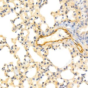 IHC检测EHD2蛋白(货号 GB114403). 样品: 小鼠肺, 4%多聚甲醛 (货号G1101) 固定12-24小时. 抗原修复: 柠檬酸抗原修复液(干粉, pH 6.0) (G1201), 98℃, 20分钟. —抗: 1: 1000稀释, 4℃ 孵育过夜. 二抗: HRP标记山羊抗兔IgG (H+L) (货号GB23303), 1: 200稀释, 室温孵育1小时. |