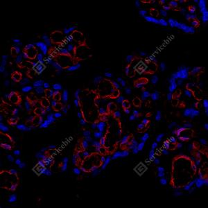 IF检测EHD2蛋白(货号 GB114403)(红色). 样品: 人胎盘, 4%多聚甲醛 (货号G1101) 固定12-24小时. 抗原修复: Tris-EDTA抗原修复液(pH 9.0) (G1203), 98℃, 20分钟. 封闭: 3% BSA(货号GC305010)的PBS溶液, 室温孵育30分钟. —抗: 1: 500稀释, 4℃ 孵育过夜. 二抗: Cy3标记山羊抗兔IgG (H+L) (货号GB21303), 1: 300稀释, 室温孵育1小时. |