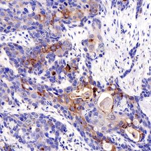 IHC检测MIIP蛋白(货号 GB113045). 样品: 人结肠癌, 4%多聚甲醛 (货号G1101) 固定12-24小时. 抗原修复: 柠檬酸抗原修复液(干粉, pH 6.0) (G1201), 98℃, 20分钟. —抗: 1: 650稀释, 4℃ 孵育过夜. 二抗: HRP标记山羊抗兔IgG (H+L) (货号GB23303), 1: 200稀释, 室温孵育1小时. |