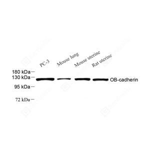 WB检测OB Cadherin蛋白(货号 GB111278). 样品: 经RIPA裂解液(货号G2002)处理的蛋白质. 封闭: 封闭: 3%脱脂牛奶(货号GC310001)溶于TBST溶液, 室温孵育1小时. —抗: 1: 500稀释, 4℃ 孵育过夜. 二抗: HRP标记山羊抗兔IgG (H+L) (货号GB23303), 1: 5000稀释, 室温孵育1小时. |