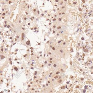 IHC检测SUN1蛋白(货号 GB115219). 样品: 大鼠胎盘, 4%多聚甲醛 (货号G1101) 固定12-24小时. 抗原修复: Tris-EDTA抗原修复液(pH 9.0) (G1203), 98℃, 20分钟. —抗: 1: 700稀释, 4℃ 孵育过夜. 二抗: HRP标记山羊抗兔IgG (H+L) (货号GB23303), 1: 200稀释, 室温孵育1小时. |