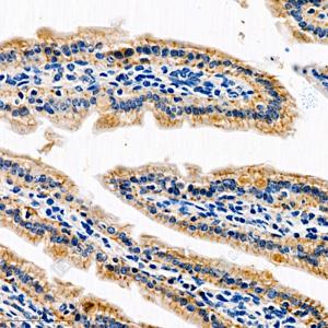 IHC检测Annexin-13/ANXA13蛋白(货号 GB111272). 样品: 小鼠小肠, 4%多聚甲醛 (货号G1101) 固定12-24小时. 抗原修复: 柠檬酸抗原修复液(干粉, pH 6.0) (G1201), 98℃, 20分钟. —抗: 1: 1500稀释, 4℃ 孵育过夜. 二抗: HRP标记山羊抗兔IgG (H+L) (货号GB23303), 1: 200稀释, 室温孵育1小时. |