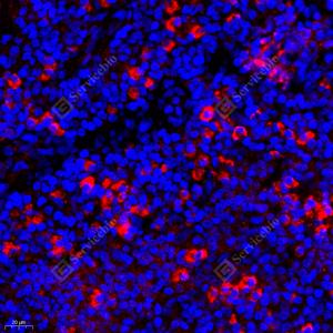 IF检测Cadherin 7蛋白(货号 GB112601)(红色). 样品: 人扁桃体, 4%多聚甲醛 (货号G1101) 固定12-24小时. 抗原修复: Tris-EDTA抗原修复液(pH 9.0) (G1203), 98℃, 20分钟. 封闭: 3% BSA(货号GC305010)的PBS溶液, 室温孵育30分钟. —抗: 1: 800稀释, 4℃ 孵育过夜. 二抗: Cy3标记山羊抗兔IgG (H+L) (货号GB21303), 1: 300稀释, 室温孵育1小时. |