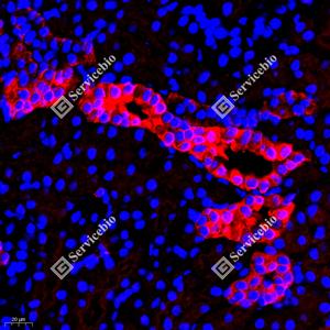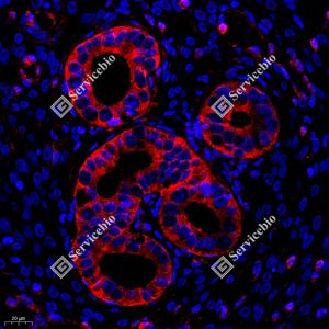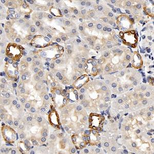 IHC检测Claudin 10蛋白(货号 GB112257). 样品: 大鼠肾, 4%多聚甲醛 (货号G1101) 固定12-24小时. 抗原修复: 柠檬酸抗原修复液(干粉, pH 6.0) (G1201), 98℃, 20分钟. —抗: 1: 700稀释, 4℃ 孵育过夜. 二抗: HRP标记山羊抗兔IgG (H+L) (货号GB23303), 1: 200稀释, 室温孵育1小时. |