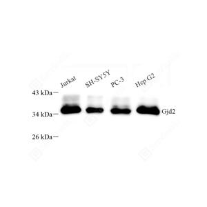 WB检测Cx36蛋白(货号 GB113268). 样品: 经RIPA裂解液(货号G2002)处理的蛋白质. 封闭: 封闭: 3%脱脂牛奶(货号GC310001)溶于TBST溶液, 室温孵育1小时. —抗: 1: 600稀释, 4℃ 孵育过夜. 二抗: HRP标记山羊抗兔IgG (H+L) (货号GB23303), 1: 5000稀释, 室温孵育1小时. |