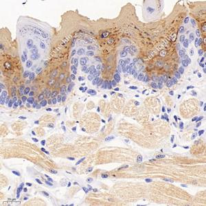 IHC检测JP-1蛋白(货号 GB114229). 样品: 小鼠舌头, 4%多聚甲醛 (货号G1101) 固定12-24小时. 抗原修复: 柠檬酸抗原修复液(干粉, pH 6.0) (G1201), 98℃, 20分钟. —抗: 1: 2000稀释, 4℃ 孵育过夜. 二抗: HRP标记山羊抗兔IgG (H+L) (货号GB23303), 1: 200稀释, 室温孵育1小时. |