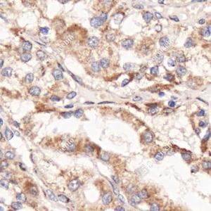 IHC检测LIMD1蛋白(货号 GB114592). 样品: 人肾癌, 4%多聚甲醛 (货号G1101) 固定12-24小时. 抗原修复: 柠檬酸抗原修复液(干粉, pH 6.0) (G1201), 98℃, 20分钟. —抗: 1: 600稀释, 4℃ 孵育过夜. 二抗: HRP标记山羊抗兔IgG (H+L) (货号GB23303), 1: 200稀释, 室温孵育1小时. |