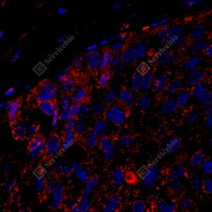 IF检测LIMD1蛋白(货号 GB114592)(红色). 样品: 人乳腺癌, 4%多聚甲醛 (货号G1101) 固定12-24小时. 抗原修复: Tris-EDTA抗原修复液(pH 9.0) (G1203), 98℃, 20分钟. 封闭: 3% BSA(货号GC305010)的PBS溶液, 室温孵育30分钟. —抗: 1: 600稀释, 4℃ 孵育过夜. 二抗: Cy3标记山羊抗兔IgG (H+L) (货号GB21303), 1: 300稀释, 室温孵育1小时. |
