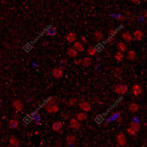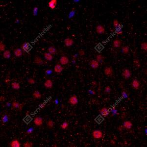 IF检测LIMD1蛋白(货号 GB114592)(红色). 样品: 小鼠脑, 4%多聚甲醛 (货号G1101) 固定12-24小时. 抗原修复: Tris-EDTA抗原修复液(pH 9.0) (G1203), 98℃, 20分钟. 封闭: 3% BSA(货号GC305010)的PBS溶液, 室温孵育30分钟. —抗: 1: 600稀释, 4℃ 孵育过夜. 二抗: Cy3标记山羊抗兔IgG (H+L) (货号GB21303), 1: 300稀释, 室温孵育1小时. |