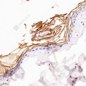 IHC检测PERP蛋白(货号 GB113922). 样品: 大鼠皮肤, 4%多聚甲醛 (货号G1101) 固定12-24小时. 抗原修复: 柠檬酸抗原修复液(干粉, pH 6.0) (G1201), 98℃, 20分钟. —抗: 1: 3000稀释, 4℃ 孵育过夜. 二抗: HRP标记山羊抗兔IgG (H+L) (货号GB23303), 1: 200稀释, 室温孵育1小时. |