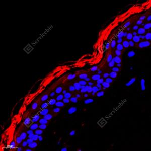 IF检测PERP蛋白(货号 GB113922)(红色). 样品: 人皮肤, 4%多聚甲醛 (货号G1101) 固定12-24小时. 抗原修复: Tris-EDTA抗原修复液(pH 9.0) (G1203), 98℃, 20分钟. 封闭: 3% BSA(货号GC305010)的PBS溶液, 室温孵育30分钟. —抗: 1: 1500稀释, 4℃ 孵育过夜. 二抗: Cy3标记山羊抗兔IgG (H+L) (货号GB21303), 1: 300稀释, 室温孵育1小时. |