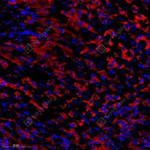 | IF检测Calreticulin蛋白(货号 GB112134)(红色). 样品: 小鼠胃, 4%多聚甲醛 (货号G1101) 固定12-24小时. 抗原修复: Tris-EDTA抗原修复液(pH 9.0) (G1203), 98℃, 20分钟. 封闭: 3% BSA(货号GC305010)的PBS溶液, 室温孵育30分钟. —抗: 1: 250稀释, 4℃ 孵育过夜. 二抗: Cy3标记山羊抗兔IgG (H+L) (货号GB21303), 1: 300稀释, 室温孵育1小时. |