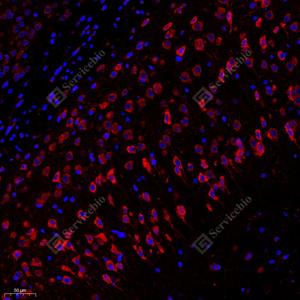 | IF检测Calreticulin蛋白(货号 GB112134)(红色). 样品: 小鼠黑质, 4%多聚甲醛 (货号G1101) 固定12-24小时. 抗原修复: Tris-EDTA抗原修复液(pH 9.0) (G1203), 98℃, 20分钟. 封闭: 3% BSA(货号GC305010)的PBS溶液, 室温孵育30分钟. —抗: 1: 250稀释, 4℃ 孵育过夜. 二抗: Cy3标记山羊抗兔IgG (H+L) (货号GB21303), 1: 300稀释, 室温孵育1小时. |