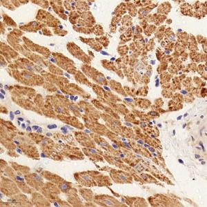 IHC检测COX IV蛋白(货号 GB12250). 样品: 大鼠心, 4%多聚甲醛 (货号G1101) 固定12-24小时. 抗原修复: 柠檬酸抗原修复液(干粉, pH 6.0) (G1201), 高压锅均匀喷气计时2分钟. —抗: 1: 1000稀释, 4℃ 孵育过夜. 二抗: HRP标记山羊抗小鼠IgG (H+L) (货号GB23301), 1: 200稀释, 室温孵育1小时. |