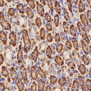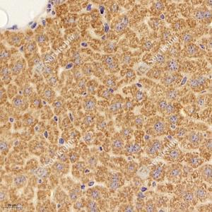 IHC检测COX IV蛋白(货号 GB12250). 样品: 大鼠肝, 4%多聚甲醛 (货号G1101) 固定12-24小时. 抗原修复: 柠檬酸抗原修复液(干粉, pH 6.0) (G1201), 高压锅均匀喷气计时2分钟. —抗: 1: 1000稀释, 4℃ 孵育过夜. 二抗: HRP标记山羊抗小鼠IgG (H+L) (货号GB23301), 1: 200稀释, 室温孵育1小时. |