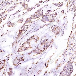 IHC检测LAMP1蛋白(货号 GB112949). 样品: 人胆管癌, 4%多聚甲醛 (货号G1101) 固定12-24小时. 抗原修复: 柠檬酸抗原修复液(干粉, pH 6.0) (G1201), 98℃, 20分钟. —抗: 1: 1000稀释, 4℃ 孵育过夜. 二抗: HRP标记山羊抗兔IgG (H+L) (货号GB23303), 1: 200稀释, 室温孵育1小时. |