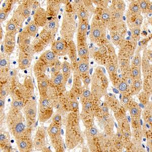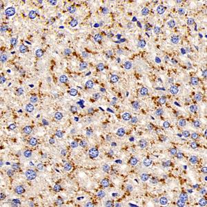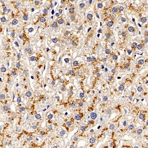 IHC检测LAMP2蛋白(货号 GB11330). 样品: 小鼠肝, 4%多聚甲醛 (货号G1101) 固定12-24小时. 抗原修复: 柠檬酸抗原修复液(干粉, pH 6.0) (G1201), 98℃, 20分钟. —抗: 1: 500稀释, 4℃ 孵育过夜. 二抗: HRP标记山羊抗兔IgG (H+L) (货号GB23303), 1: 200稀释, 室温孵育1小时. |
