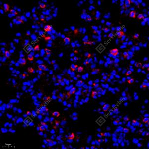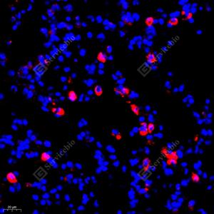 IF检测LAMP2蛋白(货号 GB11330)(红色). 样品: 小鼠肺, 4%多聚甲醛 (货号G1101) 固定12-24小时. 抗原修复: Tris-EDTA抗原修复液(pH 9.0) (G1203), 98℃, 20分钟. 封闭: 3% BSA(货号GC305010)的PBS溶液, 室温孵育30分钟. —抗: 1: 500稀释, 4℃ 孵育过夜. 二抗: Cy3标记山羊抗兔IgG (H+L) (货号GB21303), 1: 300稀释, 室温孵育1小时. |