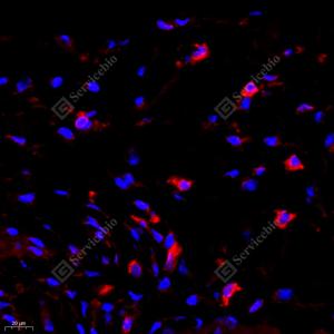 IF检测LAMP2蛋白(货号 GB11330)(红色). 样品: 大鼠结肠, 4%多聚甲醛 (货号G1101) 固定12-24小时. 抗原修复: Tris-EDTA抗原修复液(pH 9.0) (G1203), 98℃, 20分钟. 封闭: 3% BSA(货号GC305010)的PBS溶液, 室温孵育30分钟. —抗: 1: 500稀释, 4℃ 孵育过夜. 二抗: Cy3标记山羊抗兔IgG (H+L) (货号GB21303), 1: 300稀释, 室温孵育1小时. |