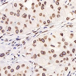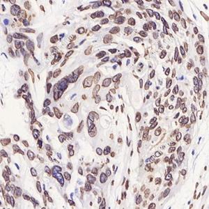 IHC检测Lamin A + Lamin C蛋白(货号 GB122400). 样品: 人宫颈癌, 4%多聚甲醛 (货号G1101) 固定12-24小时. 抗原修复: 柠檬酸抗原修复液(干粉, pH 6.0) (G1201), 高压锅均匀喷气计时2分钟. —抗: 1: 3000稀释, 4℃ 孵育过夜. 二抗: HRP标记山羊抗小鼠IgG (H+L) (货号GB23301), 1: 200稀释, 室温孵育1小时. |