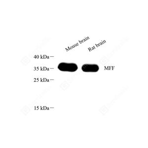 WB检测MFF蛋白(货号 GB114102). 样品: 经RIPA裂解液(货号G2002)处理的蛋白质. 封闭: 封闭: 3%脱脂牛奶(货号GC310001)溶于TBST溶液, 室温孵育1小时. —抗: 1: 1000稀释, 4℃ 孵育过夜. 二抗: HRP标记山羊抗兔IgG (H+L) (货号GB23303), 1: 5000稀释, 室温孵育1小时. |