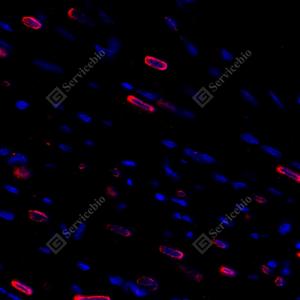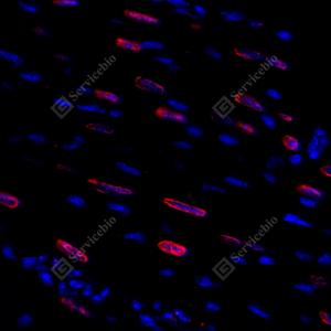 IF检测PCM1蛋白(货号 GB114537)(红色). 样品: 大鼠心, 4%多聚甲醛 (货号G1101) 固定12-24小时. 抗原修复: Tris-EDTA抗原修复液(pH 9.0) (G1203), 98℃, 20分钟. 封闭: 3% BSA(货号GC305010)的PBS溶液, 室温孵育30分钟. —抗: 1: 600稀释, 4℃ 孵育过夜. 二抗: Cy3标记山羊抗兔IgG (H+L) (货号GB21303), 1: 300稀释, 室温孵育1小时. |