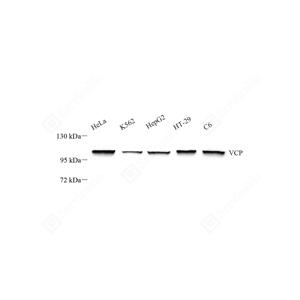 WB检测VCP蛋白(货号 GB121155). 样品: 经RIPA裂解液(货号G2002)处理的蛋白质. 封闭: 3%脱脂牛奶(货号GC310001)溶于TBST溶液, 室温孵育1小时. —抗: 1: 1000稀释, 4℃ 孵育过夜. 二抗: HRP标记山羊抗小鼠IgG (H+L) (货号GB23301), 1: 5000稀释, 室温孵育1小时. |