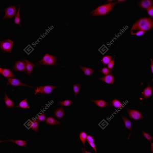 ICC检测VCP蛋白(货号 GB121155)(红色). 样品: HeLa细胞, 4%多聚甲醛 (货号G1101) 固定20分钟. 封闭: 3% BSA(货号GC305010)的PBS溶液, 室温孵育30分钟. 一抗: 1: 50稀释, 4℃ 孵育过夜. 二抗: Cy3标记山羊抗小鼠IgG (H+L) (货号GB21301), 1: 300稀释, 室温孵育1小时. |