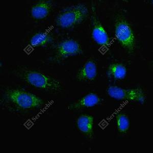 ICC检测ACBD3蛋白(货号 GB113579)(绿色). 样品: Hela细胞, 4%多聚甲醛 (货号G1101) 固定20分钟. 封闭: 3% BSA(货号GC305010)的PBS溶液, 室温孵育30分钟. 一抗: 1: 50稀释, 4℃ 孵育过夜. 二抗: Alexa Fluor 488标记山羊抗兔IgG (H+L) (货号GB25303), 1: 400稀释, 室温孵育1小时. |