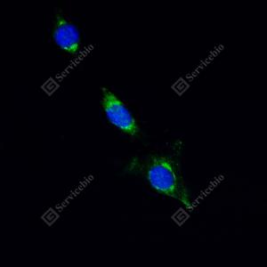 ICC检测ACBD3蛋白(货号 GB113579)(绿色). 样品: NIH-3T3细胞, 4%多聚甲醛 (货号G1101) 固定20分钟. 封闭: 3% BSA(货号GC305010)的PBS溶液, 室温孵育30分钟. 一抗: 1: 50稀释, 4℃ 孵育过夜. 二抗: Alexa Fluor 488标记山羊抗兔IgG (H+L) (货号GB25303), 1: 400稀释, 室温孵育1小时. |