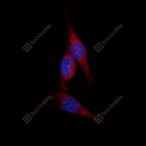 ICC检测Cytochrome C Oxidase subunit VIc/COX6C蛋白(货号 GB111489)(红色). 样品: NIH-3T3细胞, 4%多聚甲醛 (货号G1101) 固定20分钟. 封闭: 3% BSA(货号GC305010)的PBS溶液, 室温孵育30分钟. 一抗: 1: 200稀释, 4℃ 孵育过夜. 二抗: Cy3标记山羊抗兔IgG (H+L) (货号GB21303), 1: 300稀释, 室温孵育1小时. |