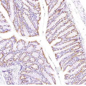 IHC检测GOLGA5/Golgin-84蛋白(货号 GB112721). 样品: 小鼠结肠, 4%多聚甲醛 (货号G1101) 固定12-24小时. 抗原修复: 柠檬酸抗原修复液(干粉, pH 6.0) (G1201), 98℃, 20分钟. —抗: 1: 1300稀释, 4℃ 孵育过夜. 二抗: HRP标记山羊抗兔IgG (H+L) (货号GB23303), 1: 200稀释, 室温孵育1小时. |