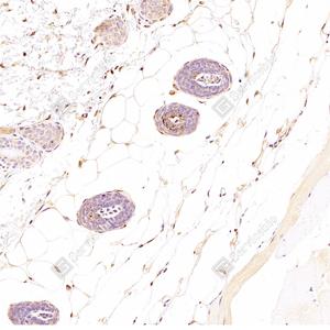 IHC检测GOLGA5/Golgin-84蛋白(货号 GB112721). 样品: 小鼠皮肤, 4%多聚甲醛 (货号G1101) 固定12-24小时. 抗原修复: 柠檬酸抗原修复液(干粉, pH 6.0) (G1201), 98℃, 20分钟. —抗: 1: 1300稀释, 4℃ 孵育过夜. 二抗: HRP标记山羊抗兔IgG (H+L) (货号GB23303), 1: 200稀释, 室温孵育1小时. |