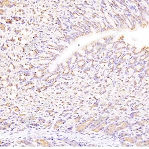 IHC检测GOLGA5/Golgin-84蛋白(货号 GB112721). 样品: 小鼠胃, 4%多聚甲醛 (货号G1101) 固定12-24小时. 抗原修复: 柠檬酸抗原修复液(干粉, pH 6.0) (G1201), 98℃, 20分钟. —抗: 1: 1300稀释, 4℃ 孵育过夜. 二抗: HRP标记山羊抗兔IgG (H+L) (货号GB23303), 1: 200稀释, 室温孵育1小时. |