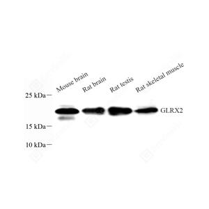 WB检测GRX2蛋白(货号 GB115091). 样品: 经RIPA裂解液(货号G2002)处理的蛋白质. 封闭: 封闭: 3%脱脂牛奶(货号GC310001)溶于TBST溶液, 室温孵育1小时. —抗: 1: 600稀释, 4℃ 孵育过夜. 二抗: HRP标记山羊抗兔IgG (H+L) (货号GB23303), 1: 5000稀释, 室温孵育1小时. |