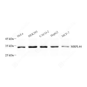 Mammalian mitochondrial ribosomal proteins are encoded by nuclear genes and help in protein synthesis within the mitochondrion. Mitochondrial ribosomes (mitoribosomes) consist of a small 28S subunit and a large 39S subunit. MRP-L44 (mitochondrial ribosomal protein L44) is a 332 amino acid protein that localizes to the mitochondrion, where it exists as a component of the 39S ribosomal subunit and works in conjunction with other MRPs to mediate protein synthesis.
