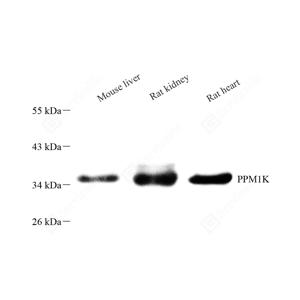 WB检测PPM1K蛋白(货号 GB112331). 样品: 经RIPA裂解液(货号G2002)处理的蛋白质. 封闭: 封闭: 3%脱脂牛奶(货号GC310001)溶于TBST溶液, 室温孵育1小时. —抗: 1: 500稀释, 4℃ 孵育过夜. 二抗: HRP标记山羊抗兔IgG (H+L) (货号GB23303), 1: 5000稀释, 室温孵育1小时. |