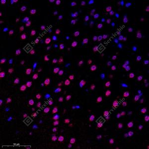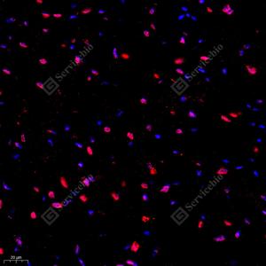 | IF检测SUN2蛋白(货号 GB112747)(红色). 样品: 大鼠心, 4%多聚甲醛 (货号G1101) 固定12-24小时. 抗原修复: Tris-EDTA抗原修复液(pH 9.0) (G1203), 98℃, 20分钟. 封闭: 3% BSA(货号GC305010)的PBS溶液, 室温孵育30分钟. —抗: 1: 2000稀释, 4℃ 孵育过夜. 二抗: Cy3标记山羊抗兔IgG (H+L) (货号GB21303), 1: 300稀释, 室温孵育1小时. |