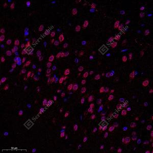 | IF检测SUN2蛋白(货号 GB112747)(红色). 样品: 小鼠黑质, 4%多聚甲醛 (货号G1101) 固定12-24小时. 抗原修复: Tris-EDTA抗原修复液(pH 9.0) (G1203), 98℃, 20分钟. 封闭: 3% BSA(货号GC305010)的PBS溶液, 室温孵育30分钟. —抗: 1: 2000稀释, 4℃ 孵育过夜. 二抗: Cy3标记山羊抗兔IgG (H+L) (货号GB21303), 1: 300稀释, 室温孵育1小时. |