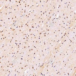 | IHC检测SUN2蛋白(货号 GB112747). 样品: 大鼠心, 4%多聚甲醛 (货号G1101) 固定12-24小时. 抗原修复: 柠檬酸抗原修复液(干粉, pH 6.0) (G1201), 98℃, 20分钟. —抗: 1: 4000稀释, 4℃ 孵育过夜. 二抗: HRP标记山羊抗兔IgG (H+L) (货号GB23303), 1: 200稀释, 室温孵育1小时. |