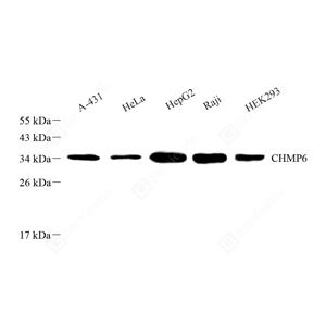 WB检测CHMP6/VPS20蛋白(货号 GB113158). 样品: 经RIPA裂解液(货号G2002)处理的蛋白质. 封闭: 封闭: 3%脱脂牛奶(货号GC310001)溶于TBST溶液, 室温孵育1小时. —抗: 1: 2000稀释, 4℃ 孵育过夜. 二抗: HRP标记山羊抗兔IgG (H+L) (货号GB23303), 1: 5000稀释, 室温孵育1小时. |