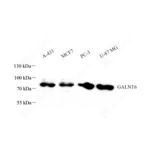 WB检测GALNT6蛋白(货号 GB114089). 样品: 经RIPA裂解液(货号G2002)处理的蛋白质. 封闭: 封闭: 3%脱脂牛奶(货号GC310001)溶于TBST溶液, 室温孵育1小时. —抗: 1: 1000稀释, 4℃ 孵育过夜. 二抗: HRP标记山羊抗兔IgG (H+L) (货号GB23303), 1: 5000稀释, 室温孵育1小时. |