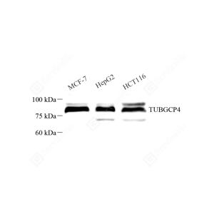 WB检测GCP4蛋白(货号 GB111447). 样品: 经RIPA裂解液(货号G2002)处理的蛋白质. 封闭: 封闭: 3%脱脂牛奶(货号GC310001)溶于TBST溶液, 室温孵育1小时. —抗: 1: 500稀释, 4℃ 孵育过夜. 二抗: HRP标记山羊抗兔IgG (H+L) (货号GB23303), 1: 5000稀释, 室温孵育1小时. |