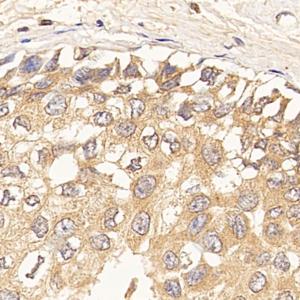 IHC检测OXA1L蛋白(货号 GB114729). 样品: 人乳腺癌, 4%多聚甲醛 (货号G1101) 固定12-24小时. 抗原修复: 柠檬酸抗原修复液(干粉, pH 6.0) (G1201), 98℃, 20分钟. —抗: 1: 500稀释, 4℃ 孵育过夜. 二抗: HRP标记山羊抗兔IgG (H+L) (货号GB23303), 1: 200稀释, 室温孵育1小时. |