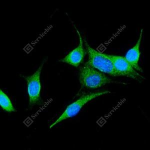 ICC检测TOMM34蛋白(货号 GB112940)(绿色). 样品: NIH-3T3细胞, 4%多聚甲醛 (货号G1101) 固定20分钟. 封闭: 3% BSA(货号GC305010)的PBS溶液, 室温孵育30分钟. 一抗: 1: 100稀释, 4℃ 孵育过夜. 二抗: Alexa Fluor 488标记山羊抗兔IgG (H+L) (货号GB25303), 1: 400稀释, 室温孵育1小时. |