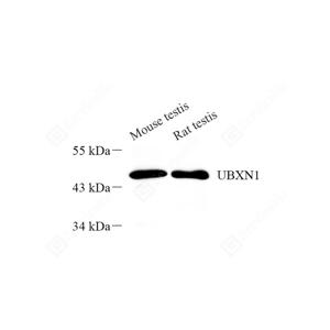 WB检测UBXN1蛋白(货号 GB112733). 样品: 经RIPA裂解液(货号G2002)处理的蛋白质. 封闭: 封闭: 3%脱脂牛奶(货号GC310001)溶于TBST溶液, 室温孵育1小时. —抗: 1: 1000稀释, 4℃ 孵育过夜. 二抗: HRP标记山羊抗兔IgG (H+L) (货号GB23303), 1: 5000稀释, 室温孵育1小时. |