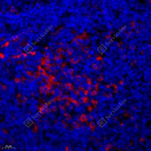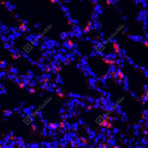IF检测Myeloperoxidase蛋白(货号 GB12224)(红色). 样品: 小鼠淋巴结, 4%多聚甲醛 (货号G1101) 固定12-24小时. 抗原修复: Tris-EDTA抗原修复液(pH 9.0) (G1203), 98℃, 20分钟. 封闭: 3% BSA(货号GC305010)的PBS溶液, 室温孵育30分钟. —抗: 1: 1000稀释, 4℃ 孵育过夜. 二抗: Cy3标记山羊抗小鼠IgG (H+L) (货号GB21301), 1: 300稀释, 室温孵育1小时. |