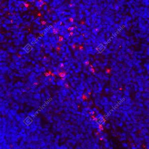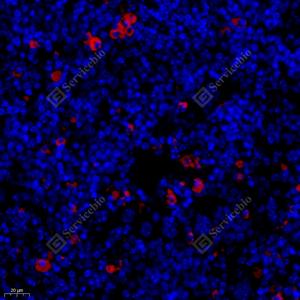 IF检测Myeloperoxidase蛋白(货号 GB12224)(红色). 样品: 小鼠脾, 4%多聚甲醛 (货号G1101) 固定12-24小时. 抗原修复: Tris-EDTA抗原修复液(pH 9.0) (G1203), 98℃, 20分钟. 封闭: 3% BSA(货号GC305010)的PBS溶液, 室温孵育30分钟. —抗: 1: 1000稀释, 4℃ 孵育过夜. 二抗: Cy3标记山羊抗小鼠IgG (H+L) (货号GB21301), 1: 300稀释, 室温孵育1小时. |